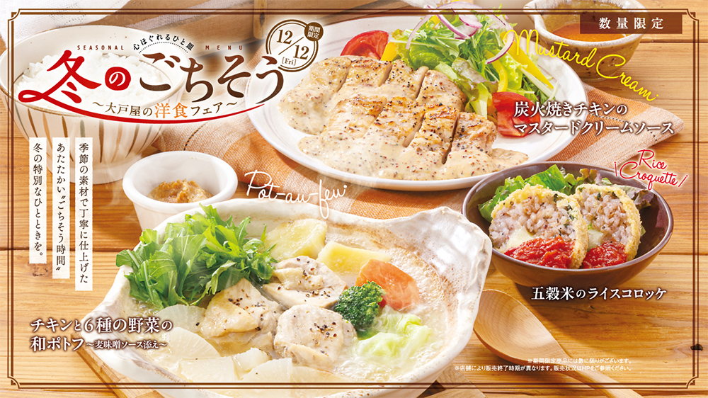 鶏の旨みを引き出したスープで6種の野菜とチキンを丁寧に煮込み、優しい味わいの一品。ご飯に合う洋食は大戸屋ならでは
