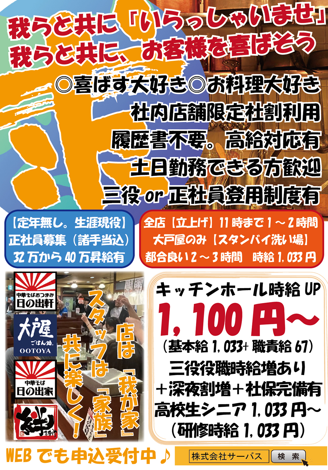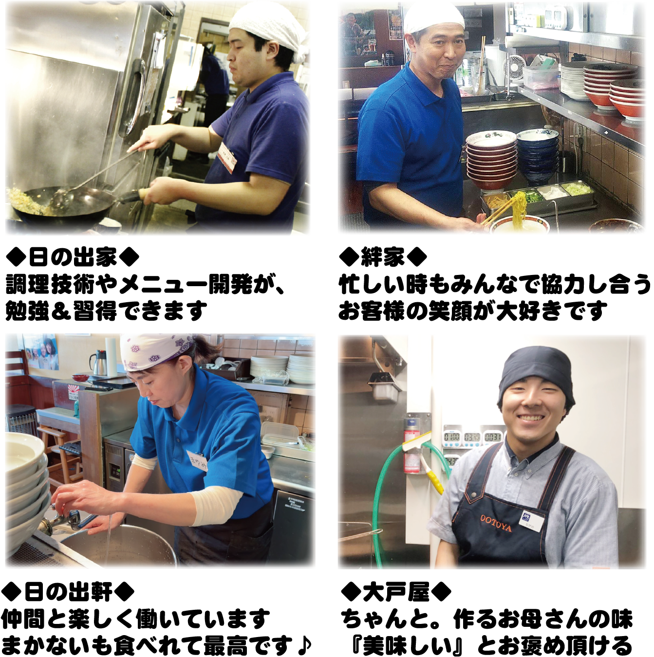 | そ の 他 | ★各種MVP表彰(褒賞金有) ★調理・接客OJT ★経験者優遇 ★未経験者大歓迎、研修は優しく丁寧に教えます ★勤務時間2時間から応相談 お好きな時間で働けます |